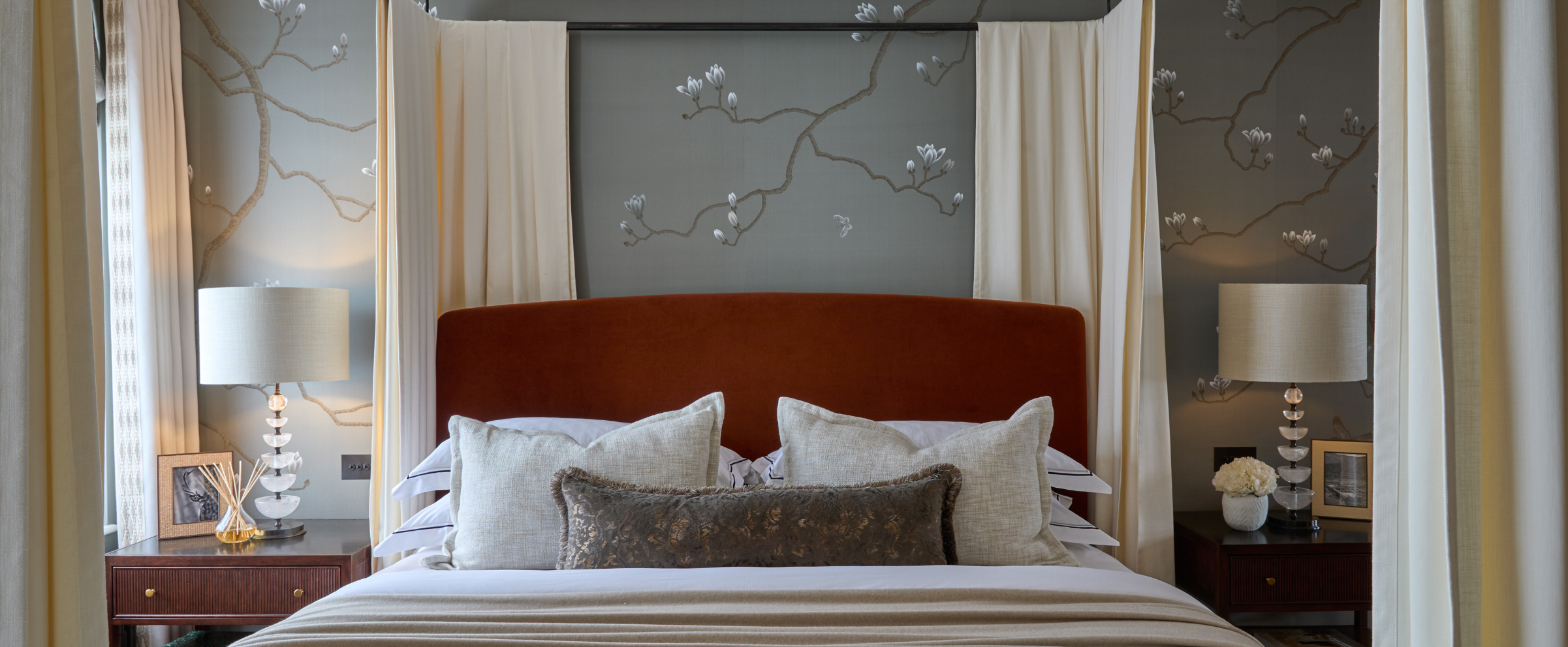 Large bedrooms can feel cold or impersonal if not designed with scale and structure in mind. One of my favourite solutions is a four-poster bed. It helps reclaim space by drawing the eye upward and creating a sense of enclosure.