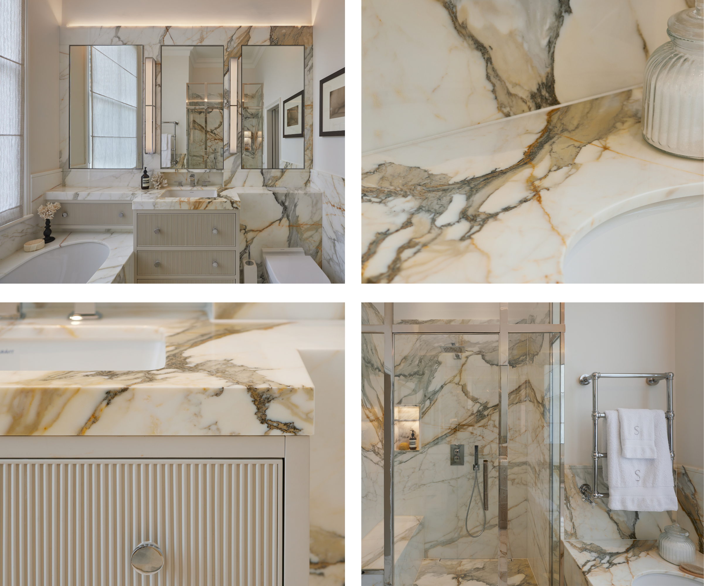 Soft blue-grey veining gives Calacatta Bluette a subtle hint of colour. We use it in bathrooms, where it introduces quiet drama and complements neutral, calming palettes.