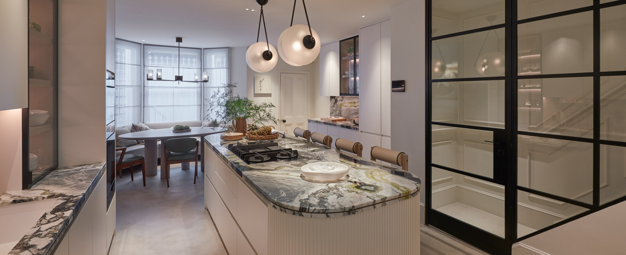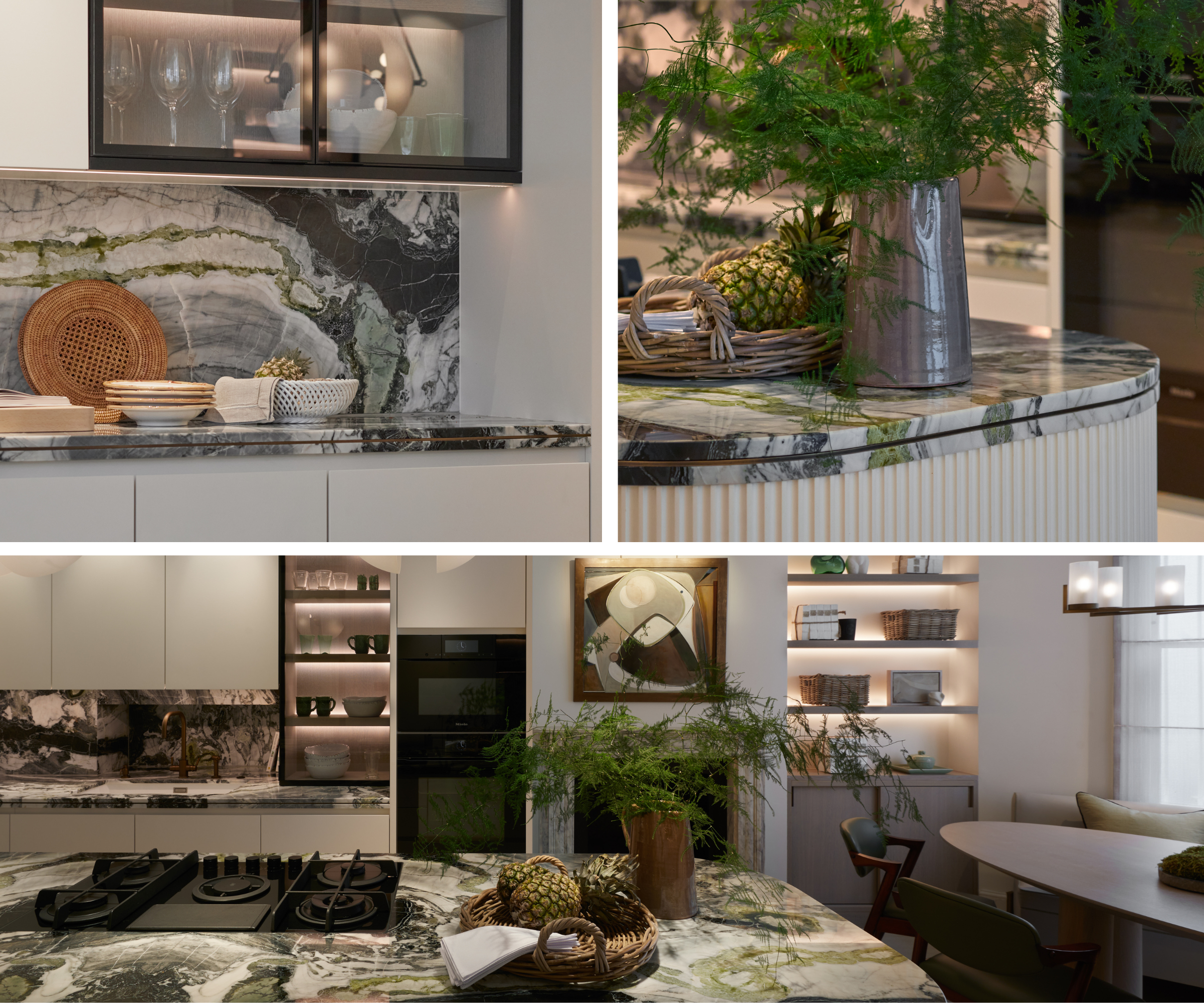 We used Cipolino marble in this kitchen design, where its bold green tones bring a sense of gentle, natural drama. The stone’s organic, flowing veining adds movement and a dynamic focal point within the space. Its unique character means no two slabs are ever alike, giving the kitchen a truly bespoke feel. We balanced the marble’s energy with soft neutral tones, allowing its beauty to take centre stage.